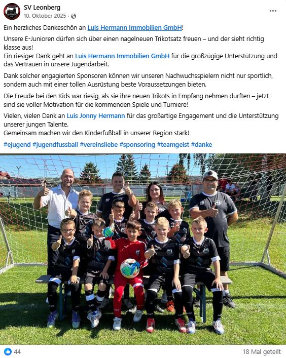 Luis Hermann Immobilien aus Deglhof zeigt eindrucksvoll, dass unternehmerischer Erfolg und gesellschaftliche Verantwortung Hand in Hand gehen können. Mit einem besonderen Fokus auf die Förderung junger Menschen engagiert sich das Unternehmen aktiv im lokalen Vereinsleben. Ein aktuelles Beispiel hierfür ist die Unterstützung der E-Junioren des SV Leonberg: Durch das Sponsoring eines neuen Trikotsatzes ermöglicht Luis Hermann Immobilien den Nachwuchsspielern nicht nur ein einheitliches und professionelles Auftreten auf dem Platz, sondern setzt zugleich ein starkes Zeichen für Teamgeist, Motivation und Zusammenhalt.
