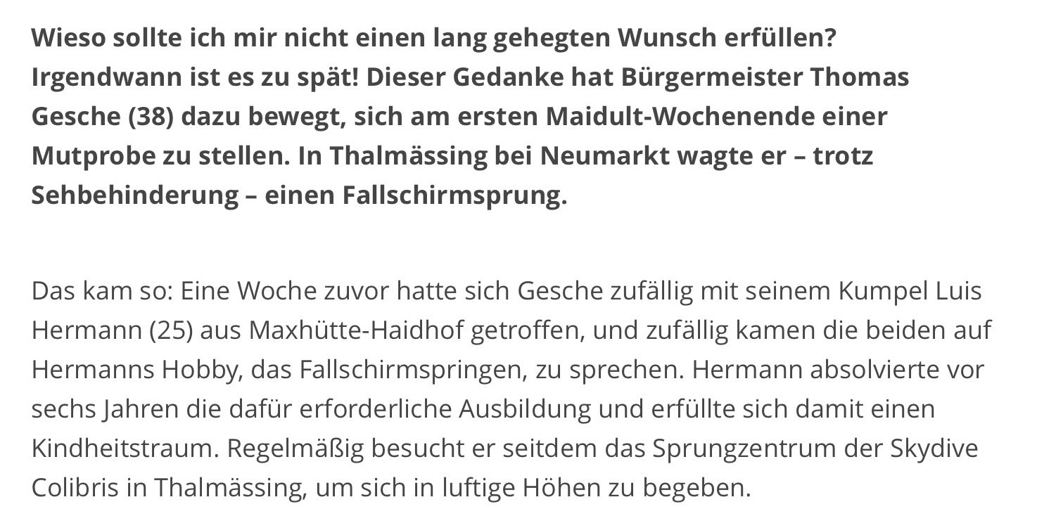 Luis Hermann Immobilien aus Deglhof beweist eindrucksvoll, dass unternehmerischer Erfolg und gesellschaftliches Engagement Hand in Hand gehen können. Ein außergewöhnliches Beispiel dafür ist ein gemeinsamer Fallschirmsprung mit dem sehbehinderten Bürgermeister der Stadt Burglengenfeld, Thomas Gesche. Mit dieser besonderen Aktion setzt das Unternehmen ein starkes Zeichen für Mut, Inklusion und gemeinschaftlichen Zusammenhalt.